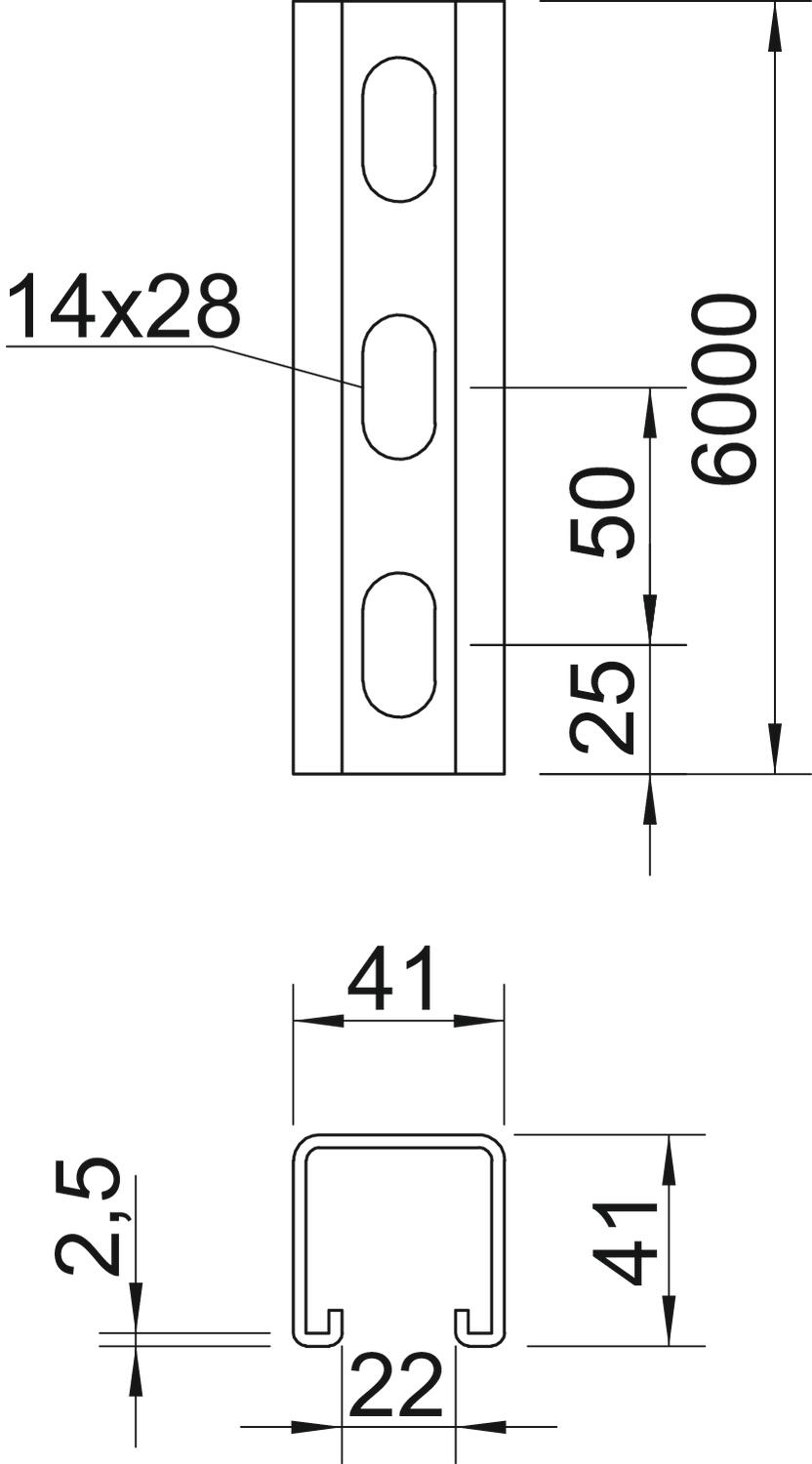 Lengte a 6m. profielrail geperforeerd sleufbreedte 22mm 41x41mm bandverzinkt OBO