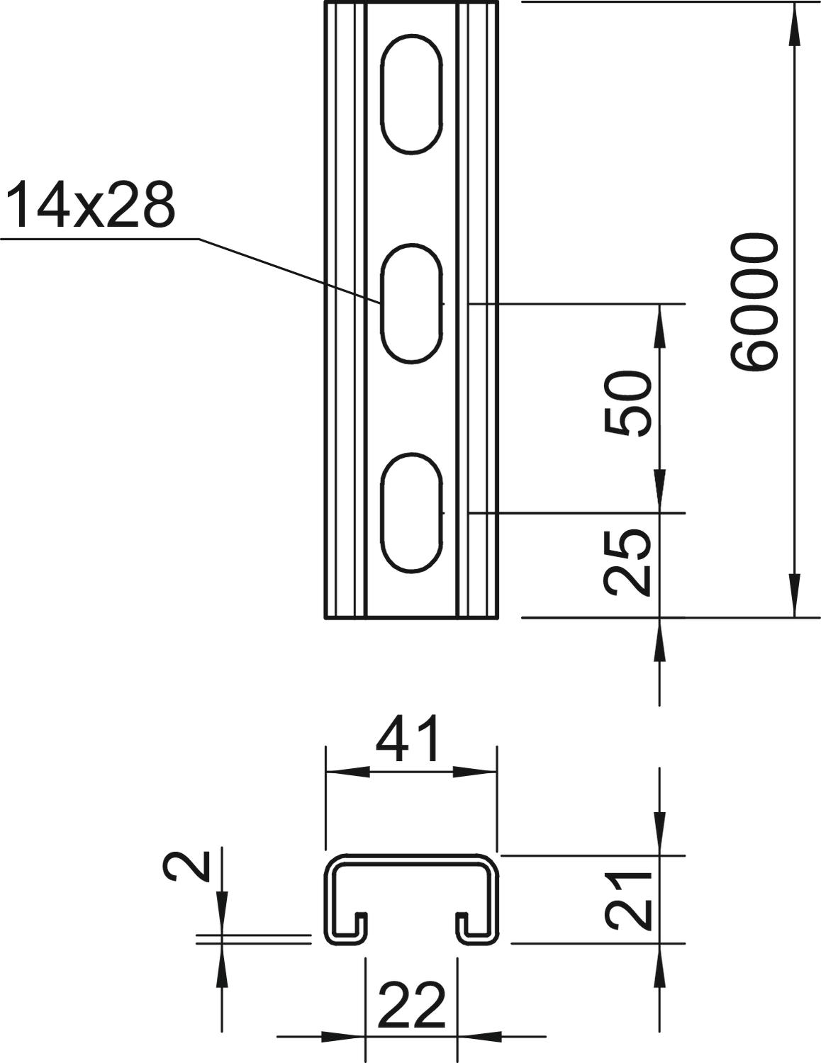 Lengte a 6m. profielrail geperforeerd sleufbreedte 22mm 41x21mm bandverzinkt OBO