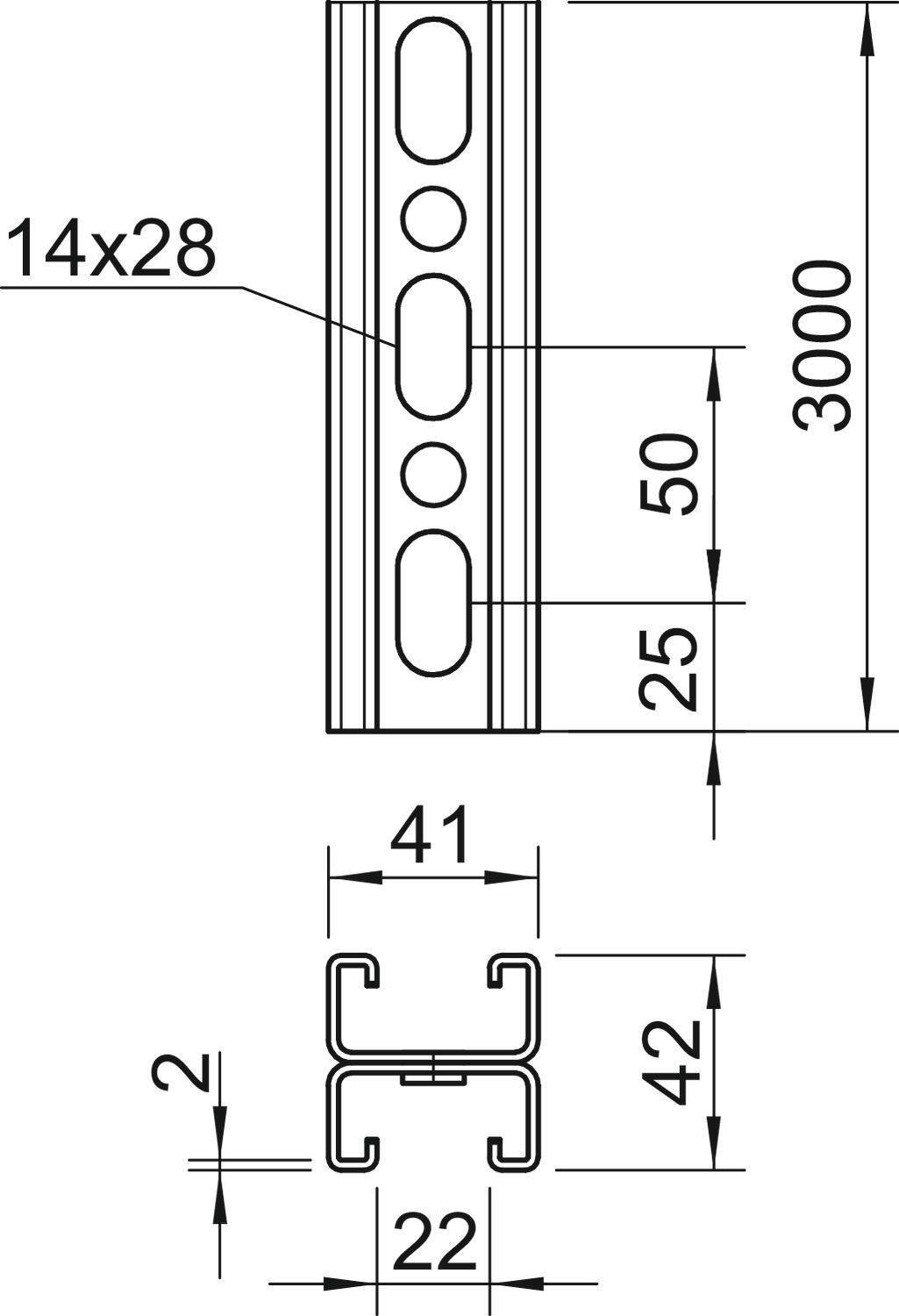 Lengte a 3m. profielrail geperforeerd sleufbreedte 22mm 41x42mm OBO