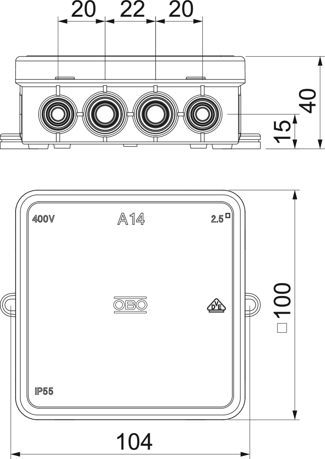 Kabeldoos met klemmenstrook 100x100x38mm polyethyleen lichtgrijs RAL7035 VVE=10 OBO