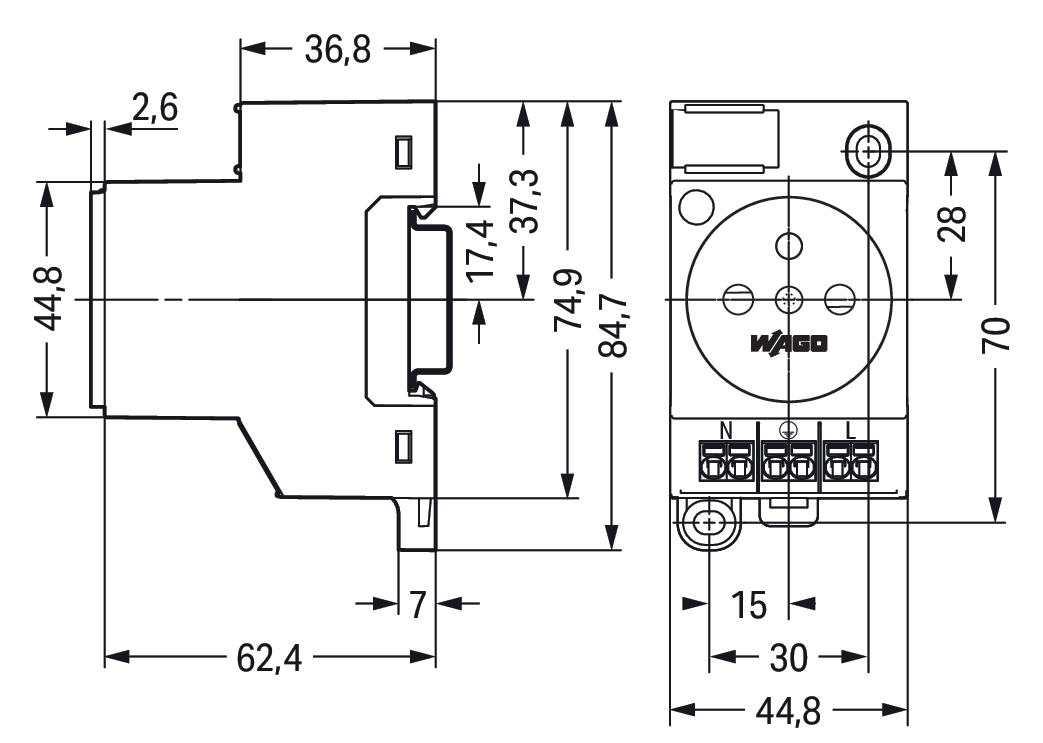 Contactdoos schakelkast voor draagrail- en schroefmontage Wago