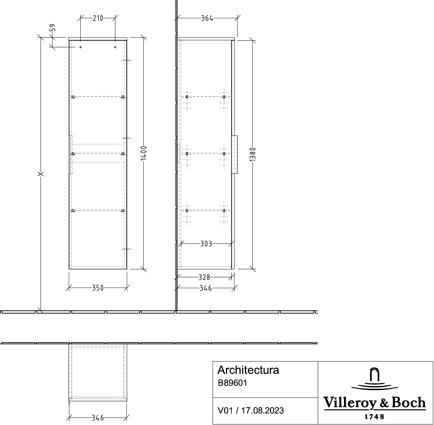 Hoge kast ARCHITECTURA 350x1400x346mm Grey B89601VT greep Volcano Black Villeroy & Boch