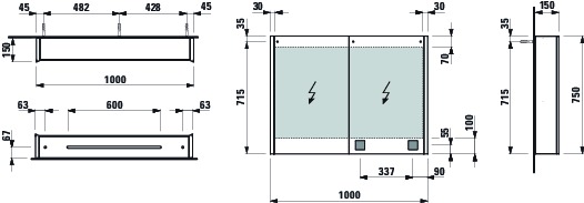Toiletkast 1000x150mm led 2x2-zijdige spiegeld. zijkant wit Laufen
