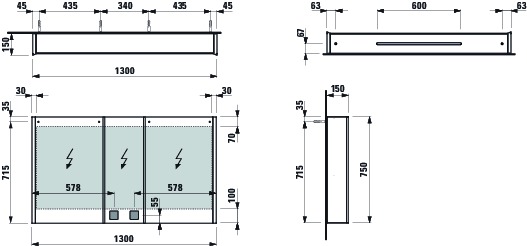 Toiletkast 1300x150mm led 3x2-zijdige spiegeldeur zijk. wit Laufen
