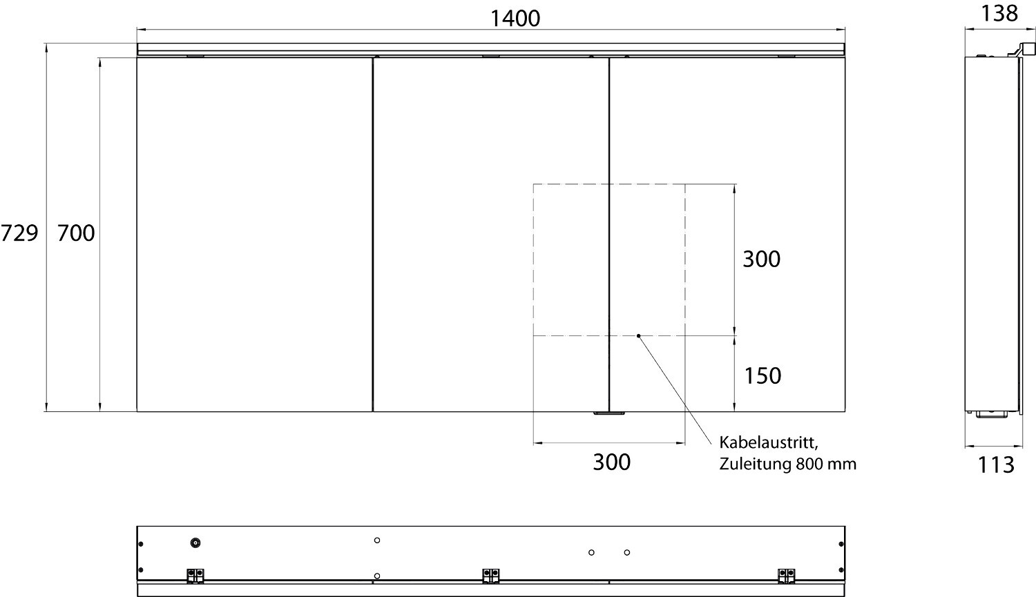 Led-spiegelkast Flat-2 Classic 1400mm aluminium opbouw 3 deuren H=729mm EMCO