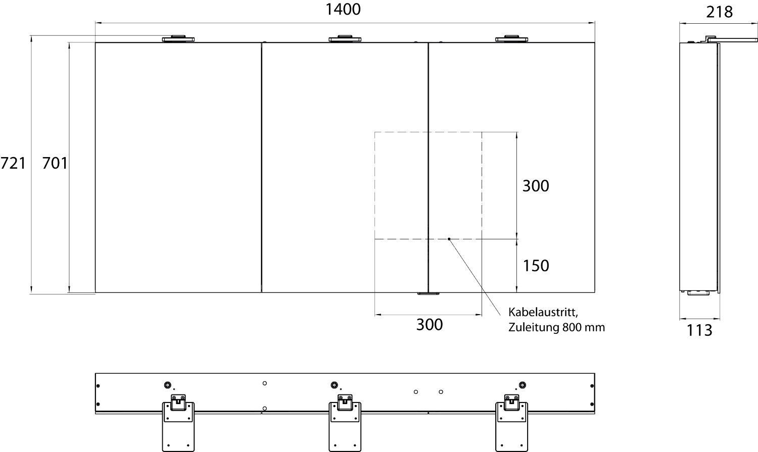 Led-spiegelkast Flat-2 Style 1400mm aluminium opbouw 3 deuren H=711mm EMCO