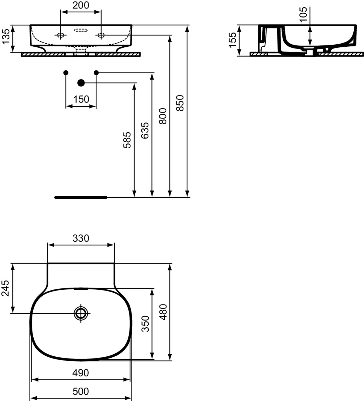 LINDA-X Wastafel 500X480X135mm z.kr.gat+gleufoverl gesl. Wit Ideal Standard