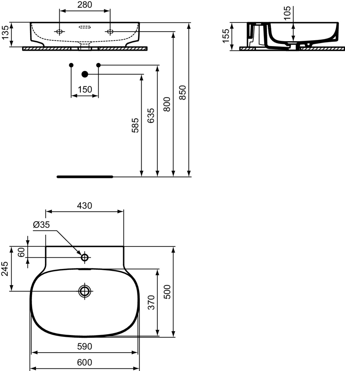 LINDA-X Wastafel 600X500X135mm +kr.gat +gleufoverl gesl. Wit Ideal Standard
