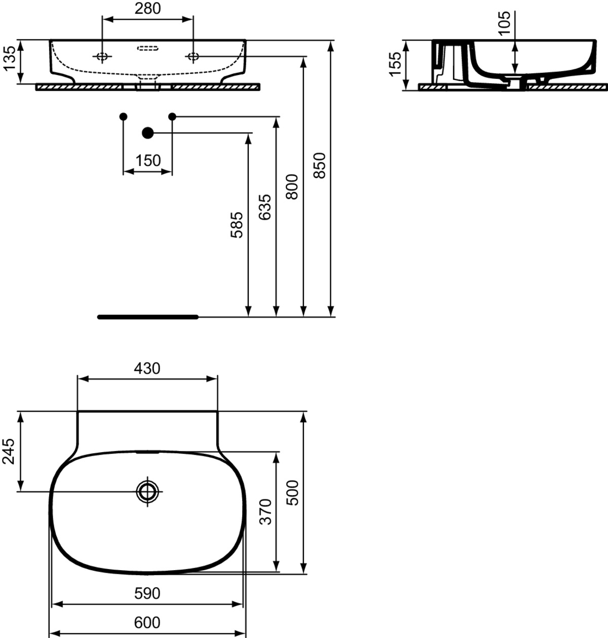 LINDA-X Wastafel 600X500X135mm z.kr.gat+gleufoverl gesl. Wit Ideal Standard