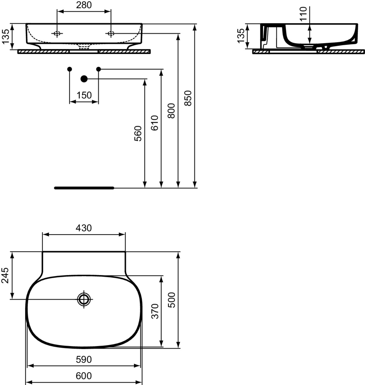 LINDA-X Wastafel 600X500X135mm z. kr.gat z. overl. gesl. Wit Ideal Standard
