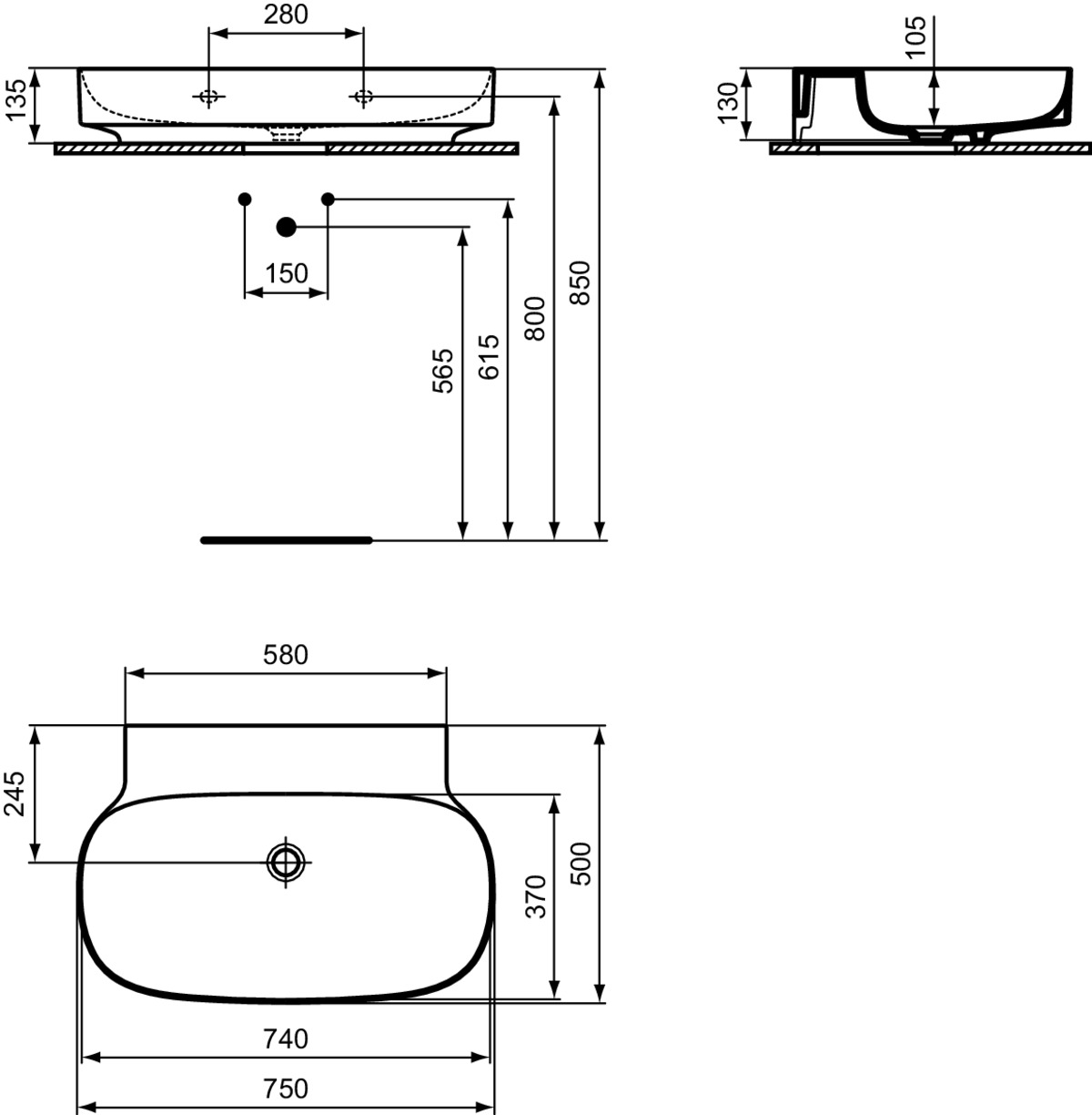 LINDA-X Wastafel 75X50X13CM z. kr.gat z. overl. gesl. Wit Ideal Standard