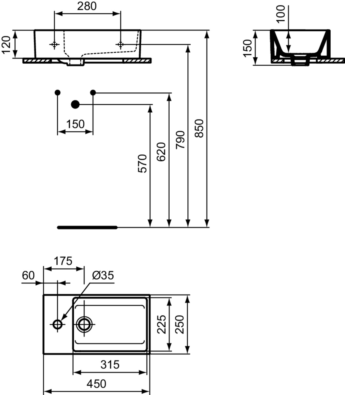 EXTRA fontein 45x25cm links met kraangat met overloop gesl. wit Ideal Standard