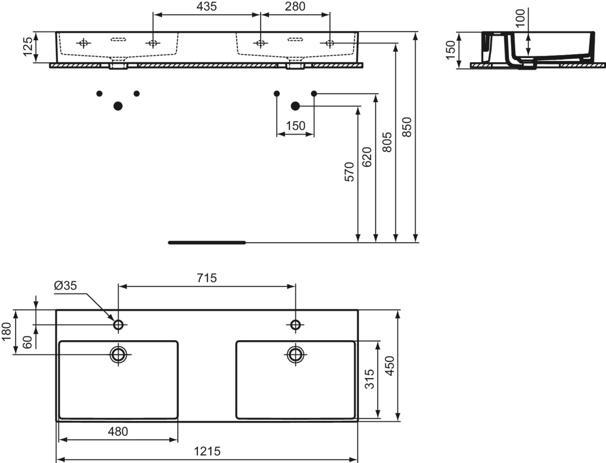 Dubbel Wastafel 1215x450x150mm wit 2 kraangaten overloop Extr R055901 Ideal Standard