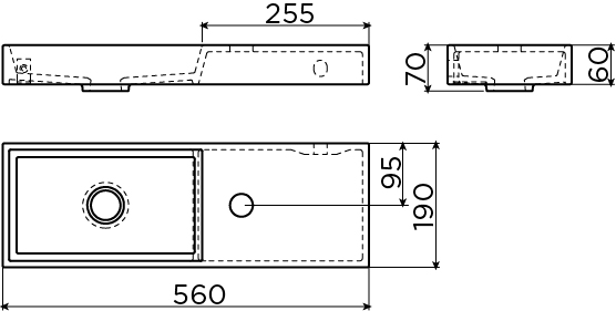 Fontein 560x190mm mat zwart RE met kraangat zonder overloop/plug Clou