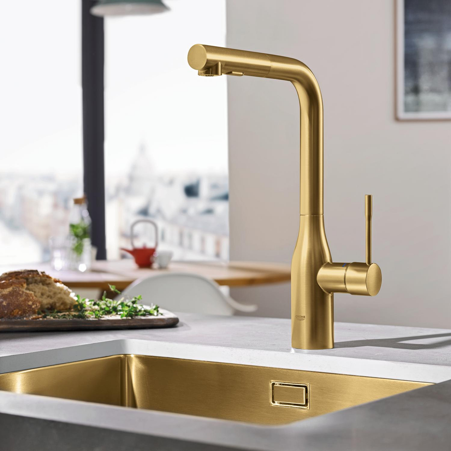 Essence keukenmengk. L-uitloop dual spray cool sunrise geborsteld (mat goudkleurig) Grohe
