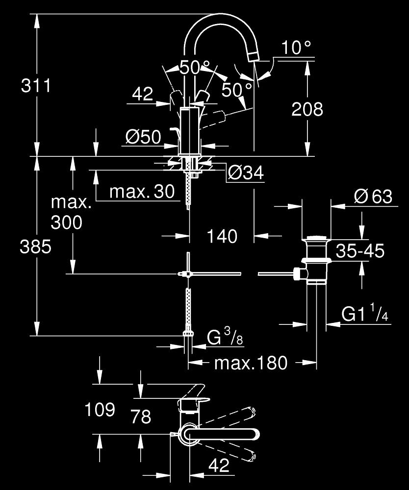 - Opbouwhoogte onderkant kraanmondstuk: 208 mm