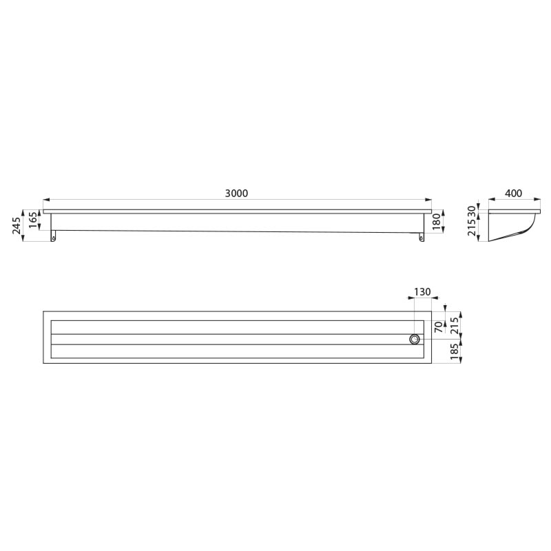 Wastafel L.3000 zonder kraangat afloop rechts RVS 304 mat Delabie